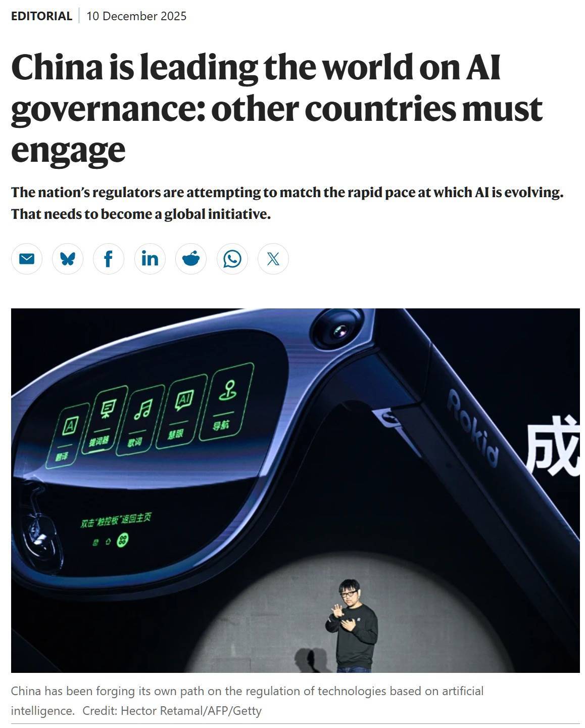 而对于乐奇Rokid,Nature则在标题中直接点明:“中国正积极推动人工智能全球治理,其他国家应积极参与对话与合作。”