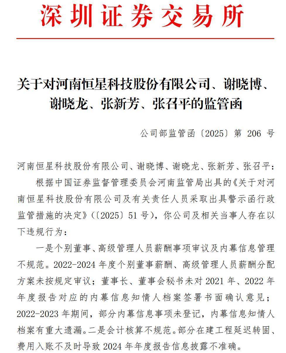 12月5日,恒星科技(002132)和相关责任人员收深交所监管函。恒星科技存在个别董事和高级管理人员在薪酬事项审议和内幕信息管理以及会计核算方面的不规范行为。