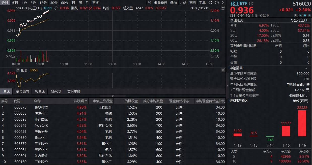 1月19日,化工板块再度猛攻。反映化工板块整体走势的化工ETF(516020)小幅低开后直线拉升,截至发稿,场内价格涨2.3%。