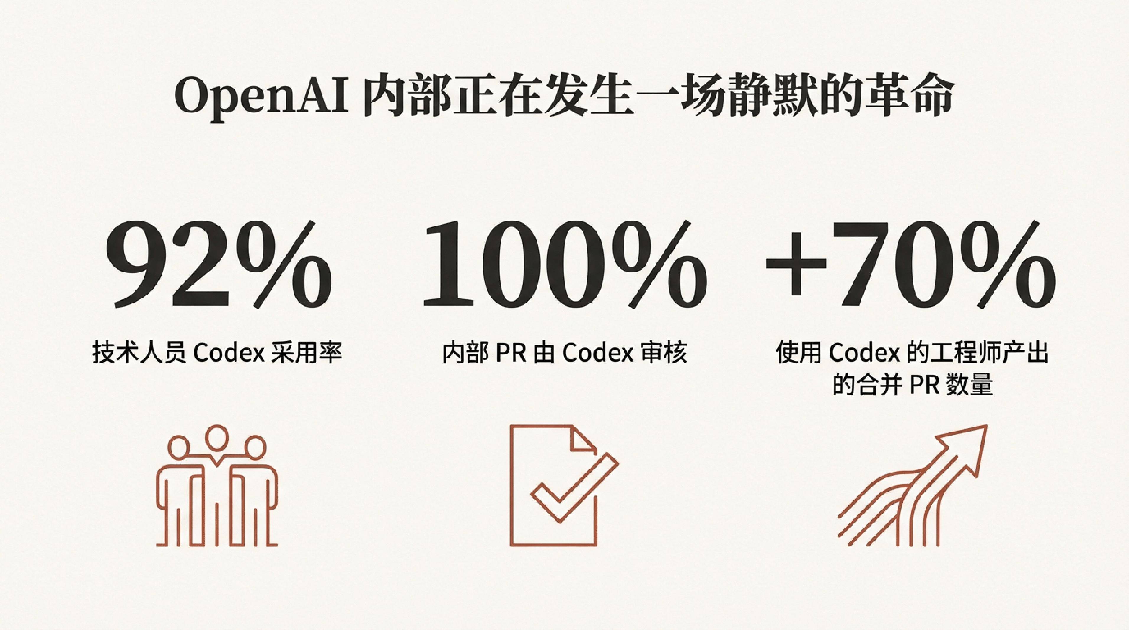 OpenAI 内部技术人员的 Codex 采用率超过 92%,所有内部 PR 都由 Codex 审核,使用 Codex 的工程师产出的合并 PR 比不用的多 70%