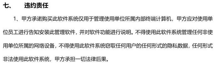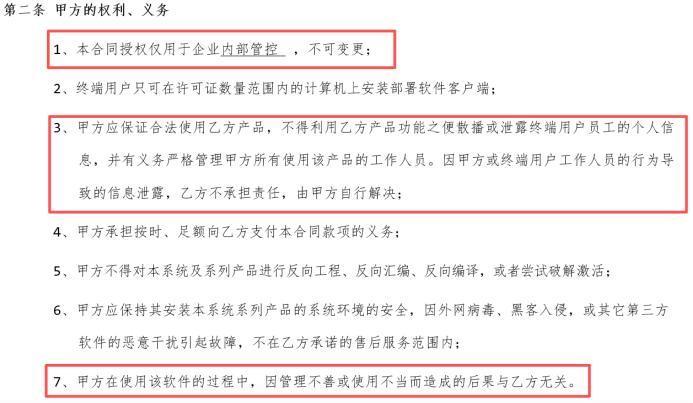 图片图片来源:安固销售人员提供的某科技公司与固信的采购合同扫描件这些客户均购买了记者测试的这款软件吗?销售人员称,网关属于不同的功能,是可以单独购买的,宣传材料中列示的公司客户并非全部购买了监控功能。调查过程中,记者发现,两家公司的合同范本均对采购方的权利义务及安全责任做出规定。