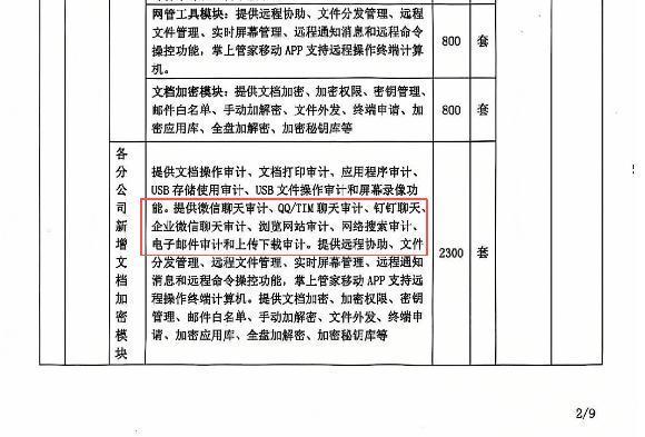 图片图片来源:安固销售人员提供的国内大型知名IT服务商与固信的采购合同扫描件记者还注意到,部分合同的采购方和收货方并非同一家公司。一家位于武汉市的小型科技公司委托固信将产品送至北京市朝阳区建国门外大街甲6号WWT大厦某层交货,该合同的货物清单明确显示,“提供微信聊天审计、QQ/TIM聊天审计、钉钉聊天、企业微信聊天审计、浏览网站审计、网络搜索审计、电子邮件审计和上传下载审计”的模块购买数量为2300套。