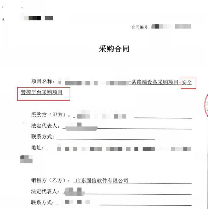 图片图片来源:安固销售人员提供的某理工科院校的采购合同扫描件而为了证明“总公司”的实力,销售人员还发来多份固信的销售合同扫描件,其中一份合同的采购方显示为国内大型知名IT服务商,合同信息显示,该公司采购的软件为“安全管控平台”。